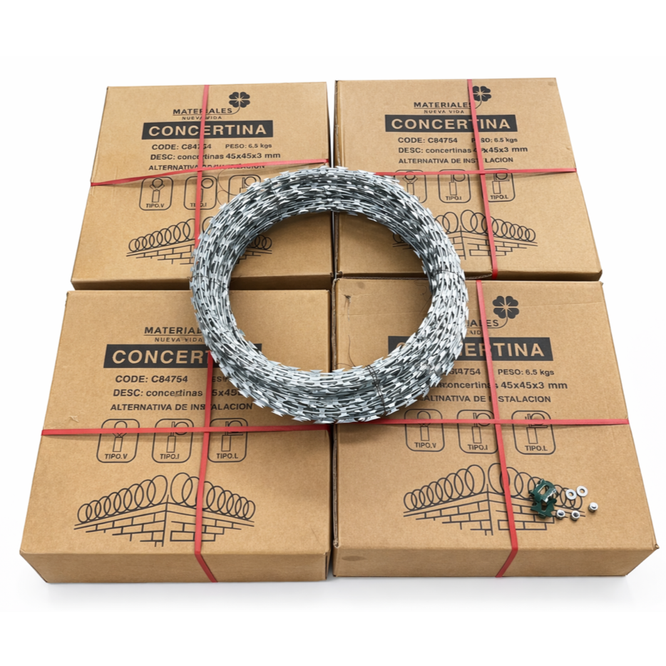 Refuerza la seguridad de tu terreno, obra o industria con una concertina resistente, duradera y de instalación rápida. Diseñada para brindar protección real y una barrera disuasiva efectiva.